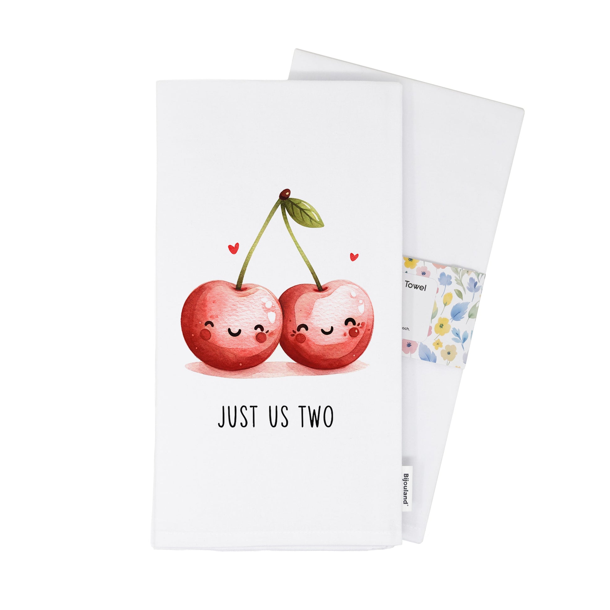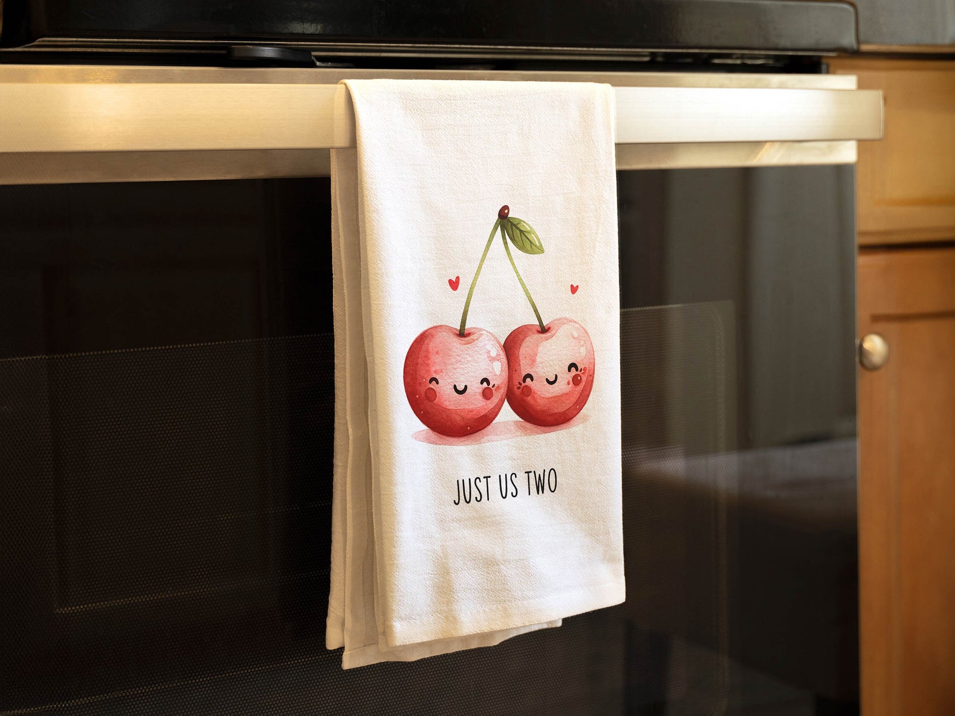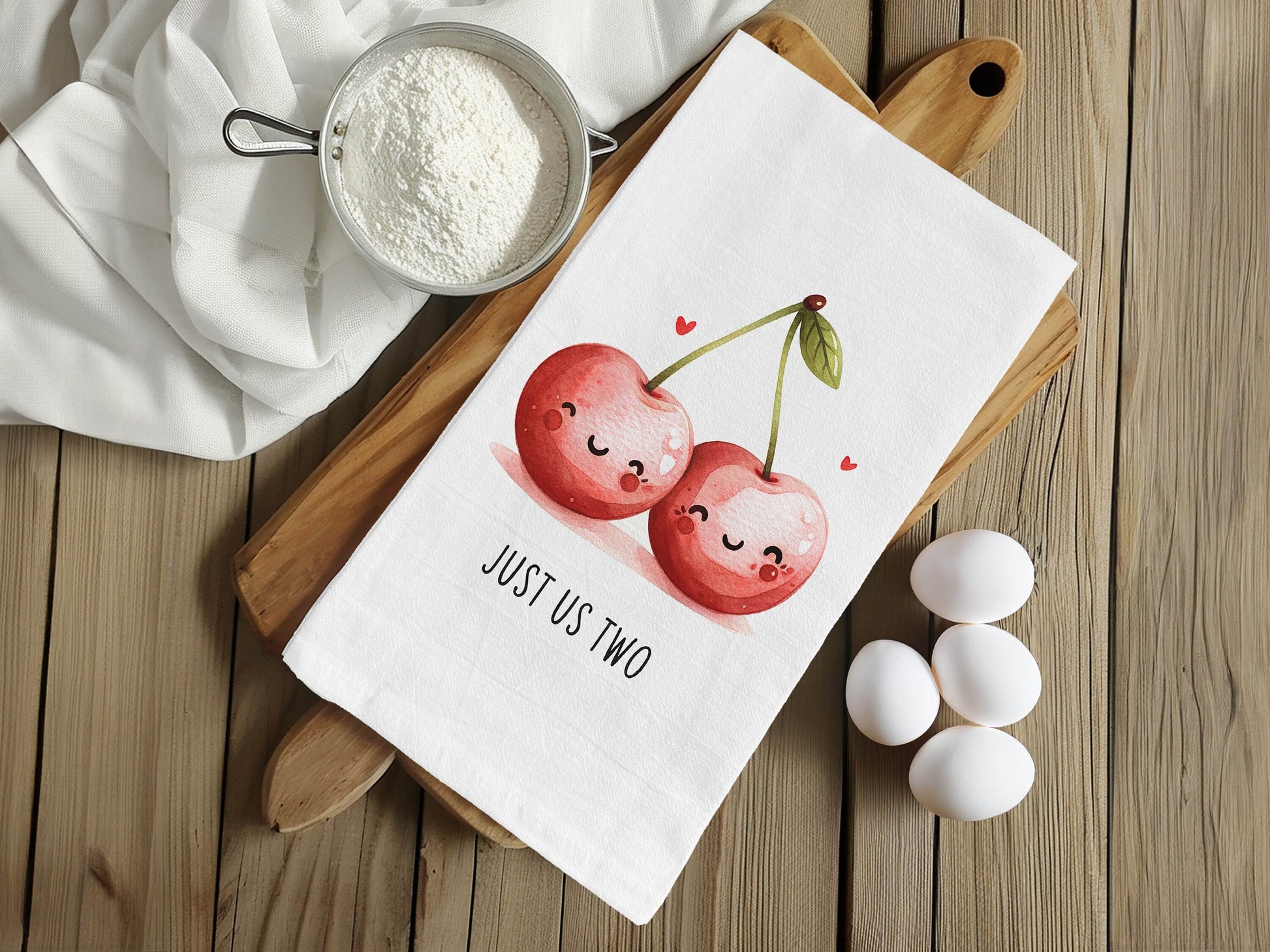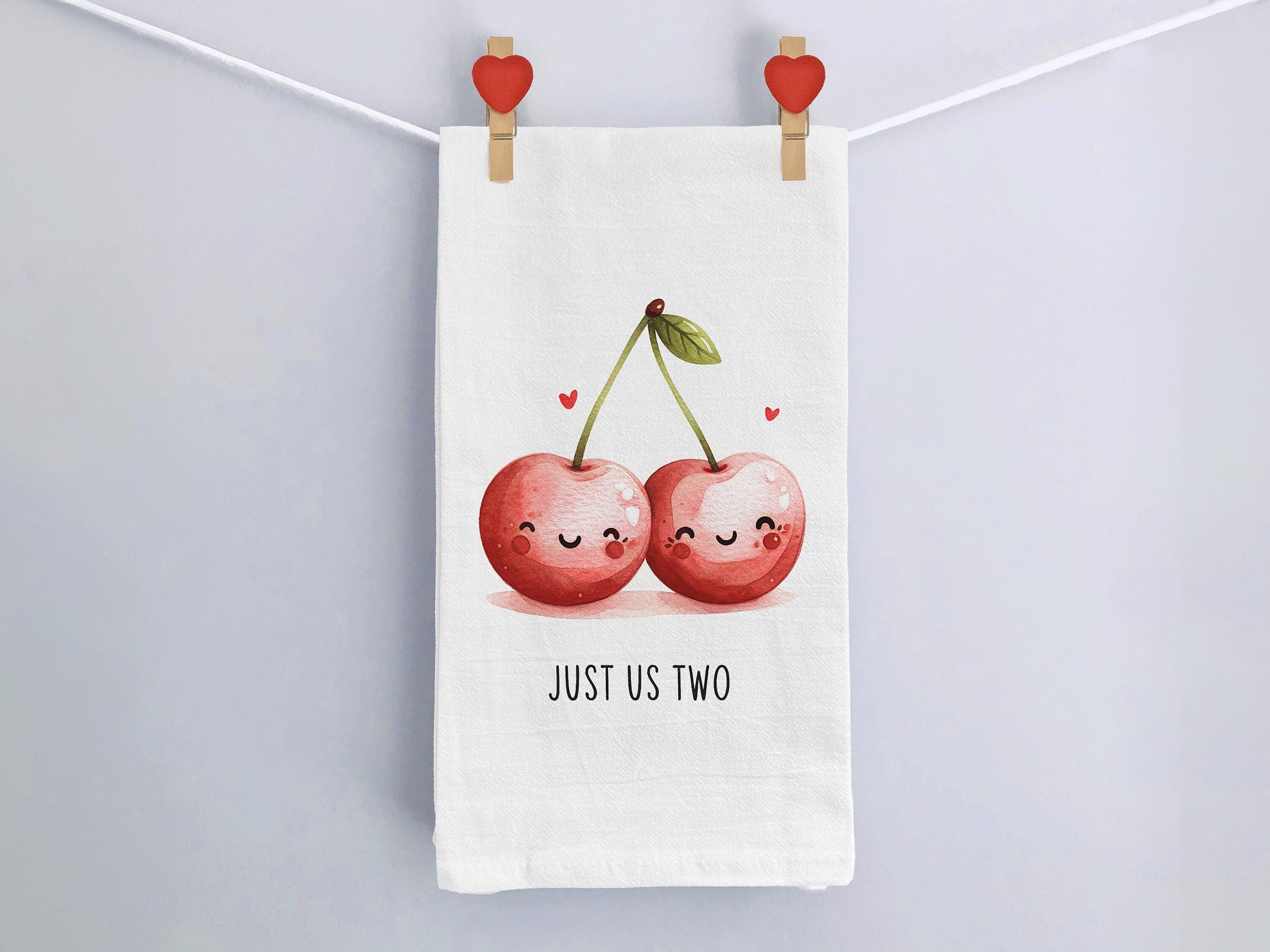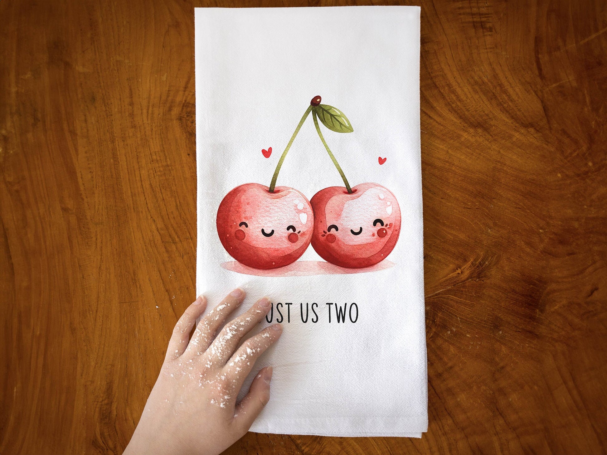 Cute Valentine's Day Cherry Towel - Just Us Two - Flour Sack Kitchen Towel - Cherries Kitchen Towel Decor