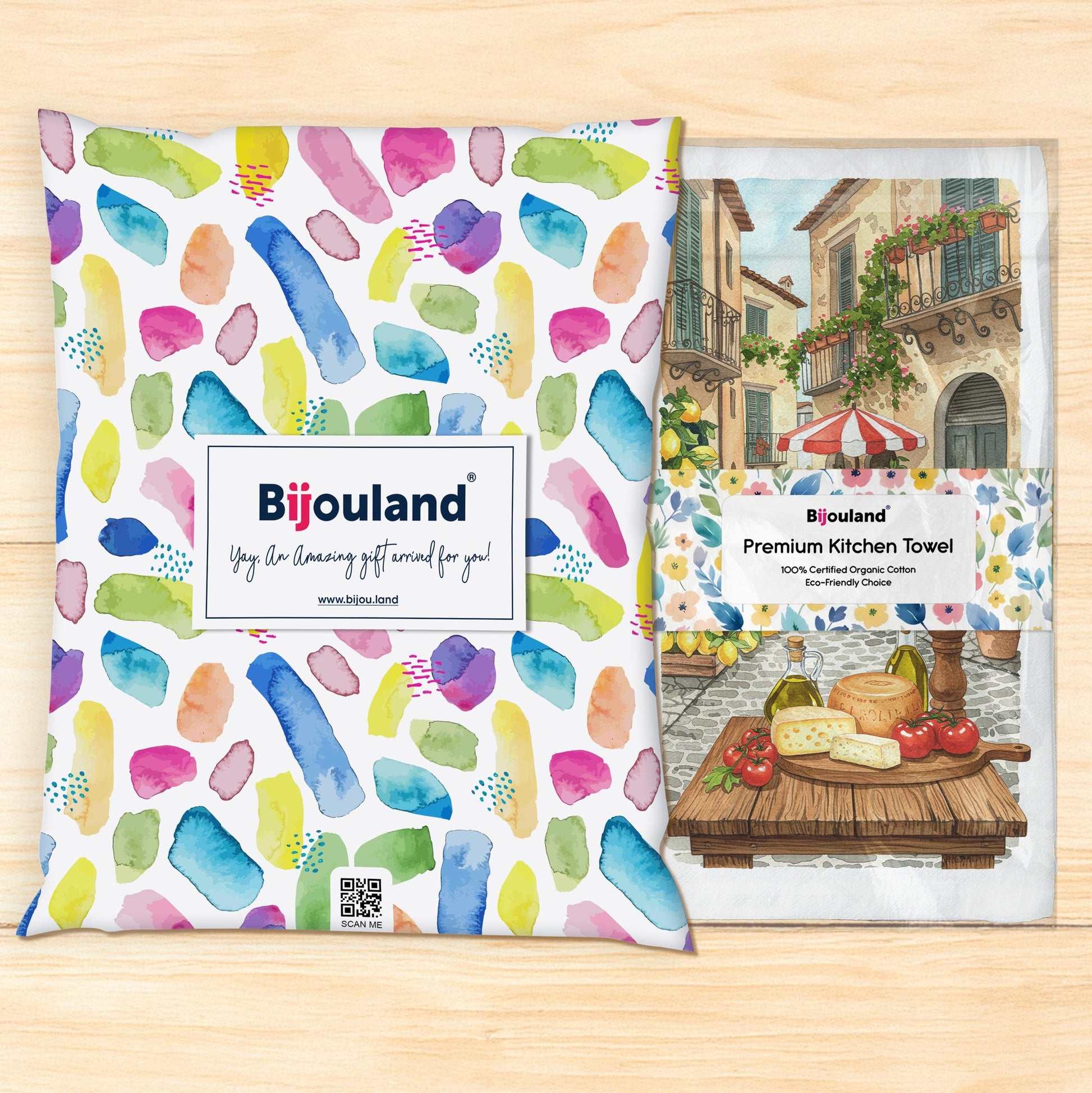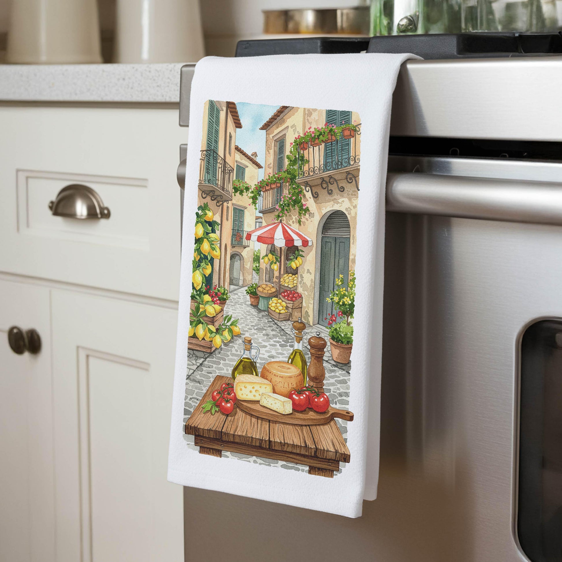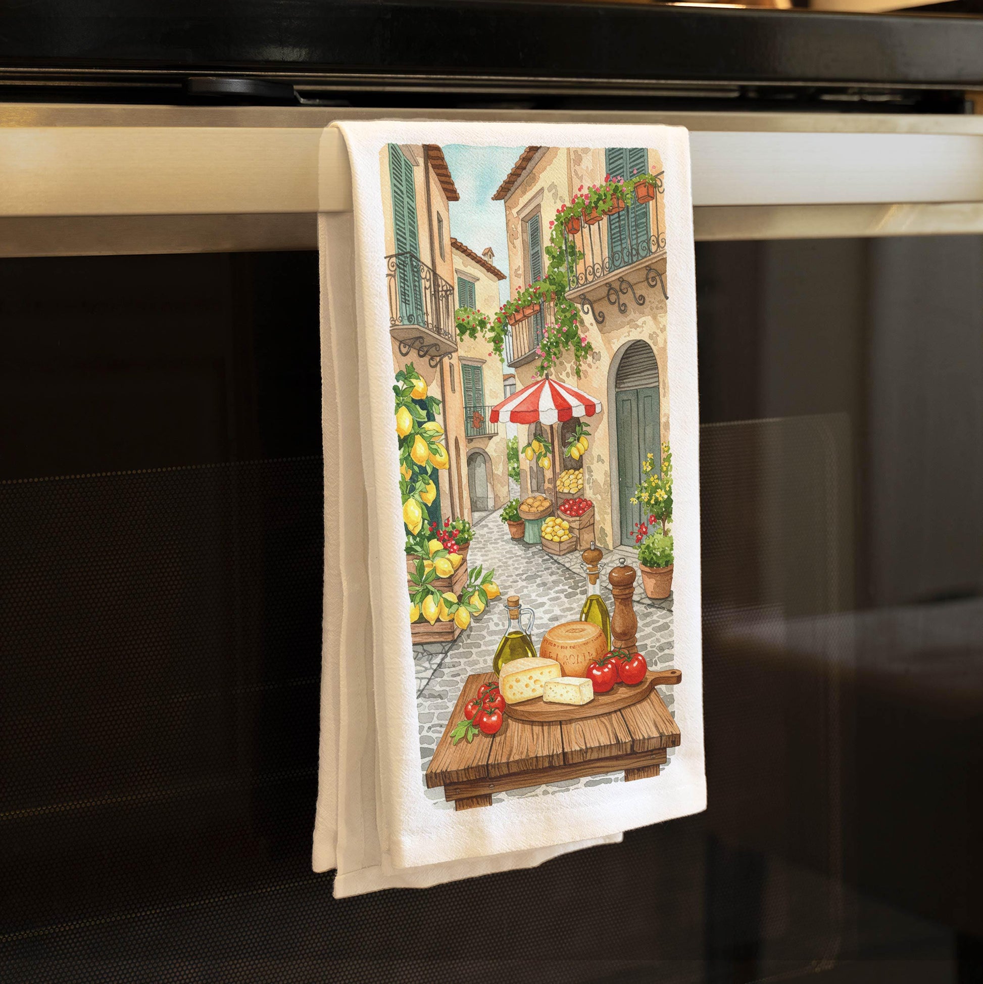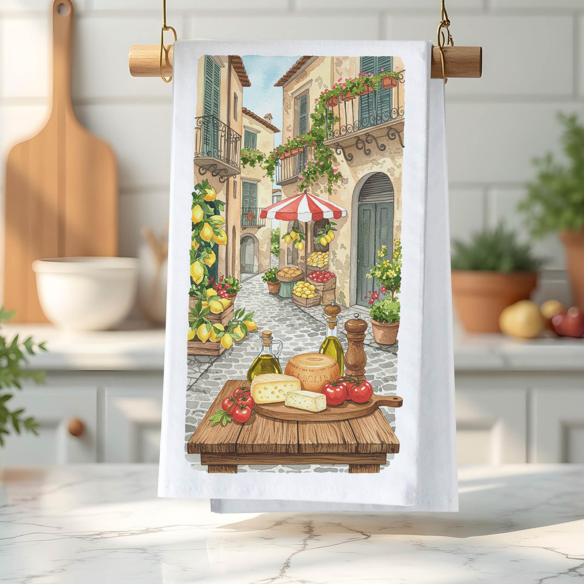 Charm of an Italian streets to your kitchen with Italian street market scene flour sack towel! Featuring a picturesque cobblestone street, fresh lemons, tomatoes, cheese, and olive oil, this towel is a warm and inviting addition to any home. Whether you're looking for a hostess gift, housewarming present, or Tuscan-style kitchen decor, this towel brings a touch of Italy to your home.