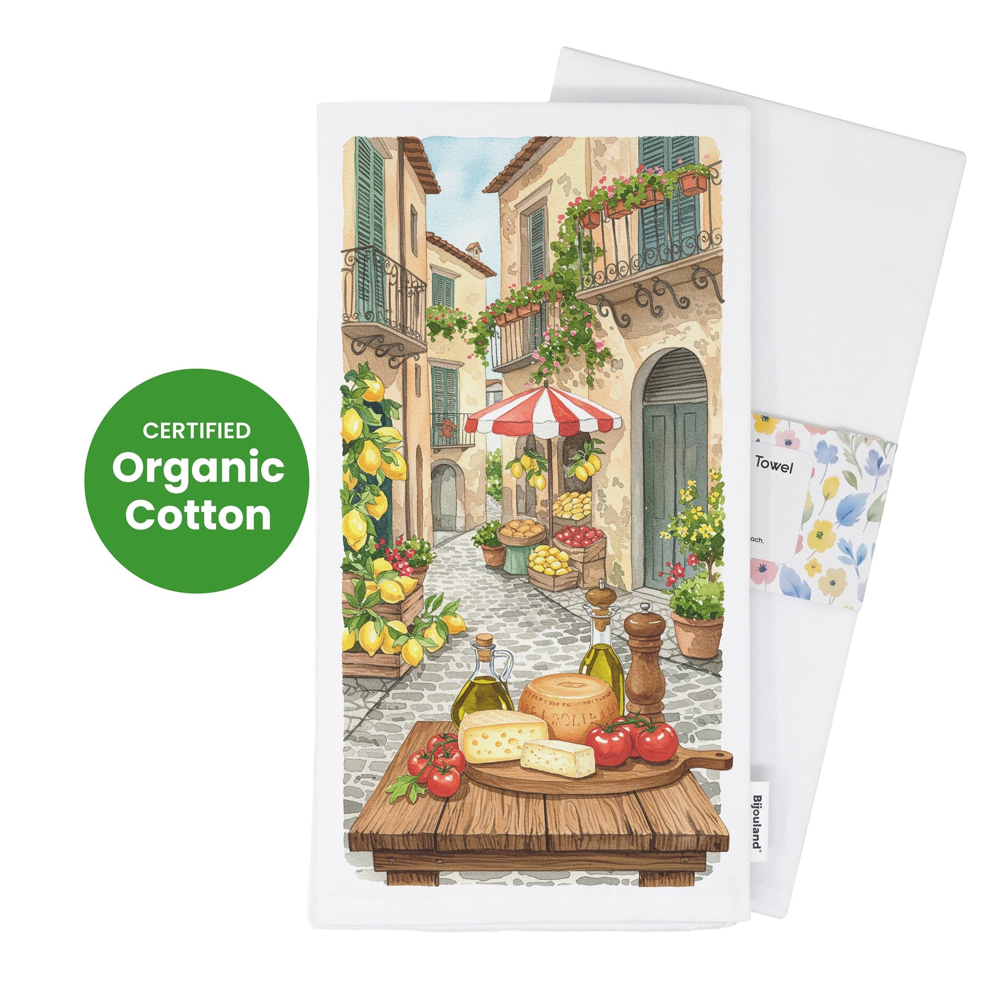 Italian Kitchen Towel - Italian Street Market Scene, Rustic Decor, Italy Inspired Gift - Flour Sack Organic Cotton Dish Towel