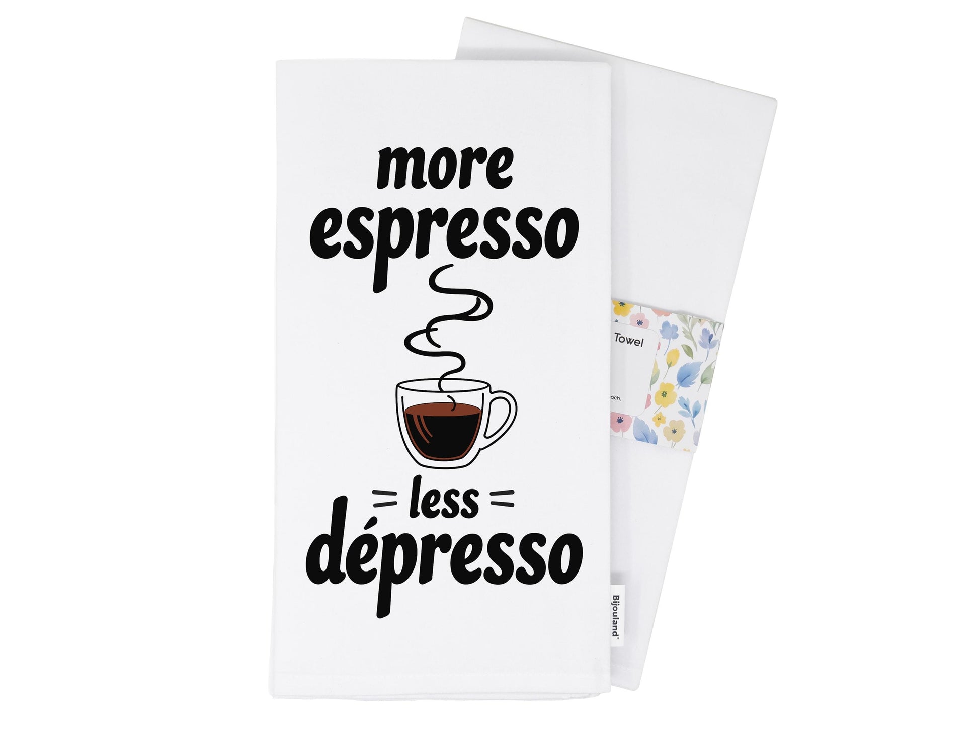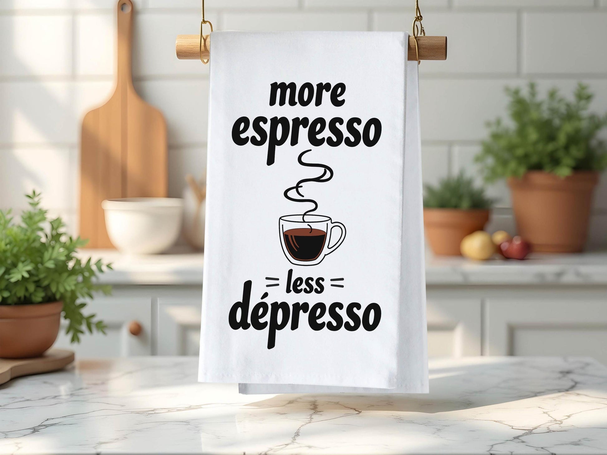 Add a touch of humor to your kitchen with this adorable coffee themed towel: More Espresso Less Depresso. Perfect for coffee enthusiasts and espresso lovers, this towel combines functionality with charm.